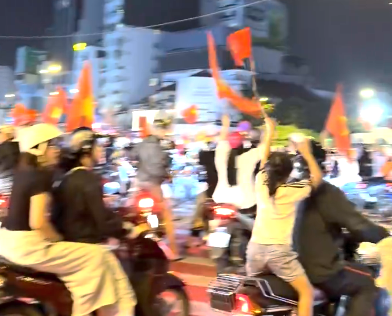 有网友曝光了越南今夜街头的盛况:灯火通明的街道,数万人骑着摩托车走出家门,他们扛着越南的国旗,一起呐喊、跳跃,为球队夺得U23亚洲杯季军而兴奋,为他们23年来首次赢下韩国队而激动!